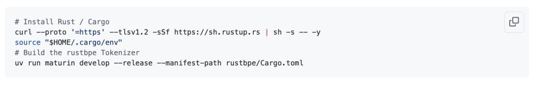 Next, you need to install Rust/Cargo so that you can compile a custom Rust tokenizer . Introducing a new/custom tokenizer is a bit of a hassle, but unfortunately, Kapathy felt that the Python version in the early minbpe project was too slow, and the huggingface tokenizer was too bloated and confusing.
