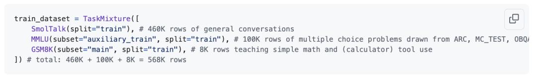 Midtrain is performed on the SmolTalk user-assistant dialogue dataset, multiple-choice question dataset, and tool usage dataset.