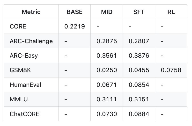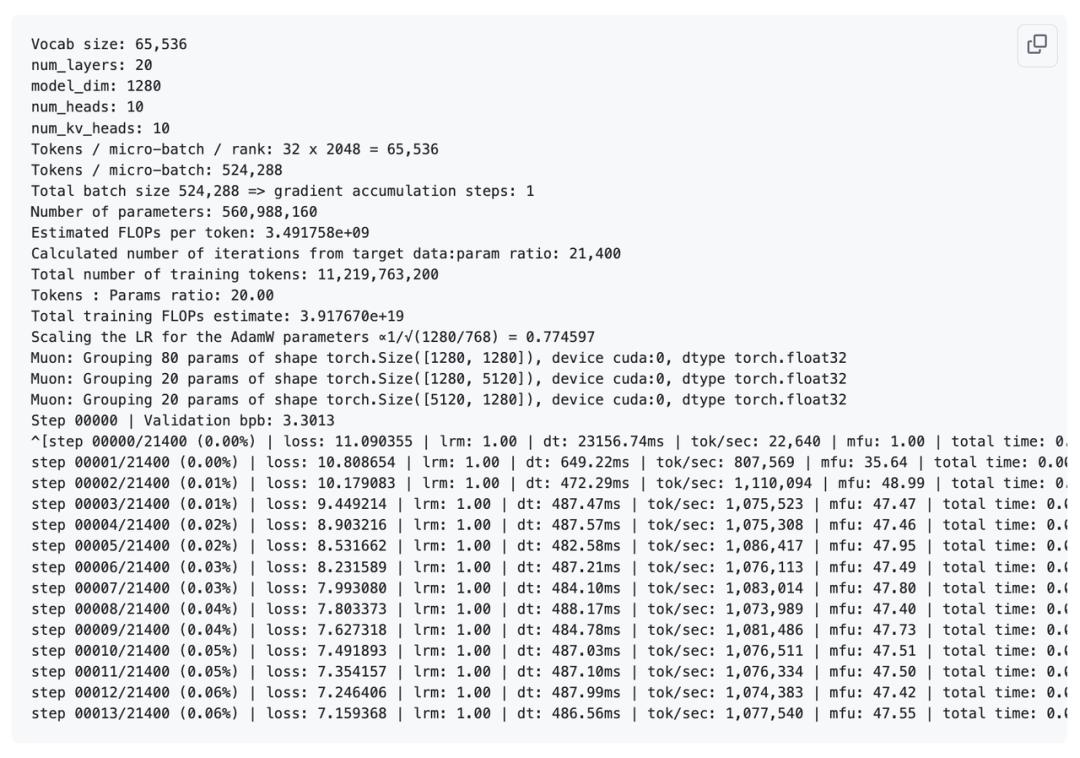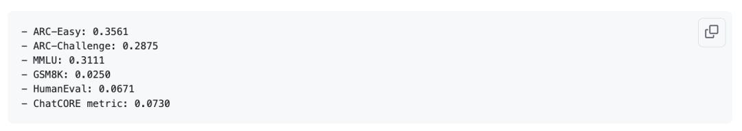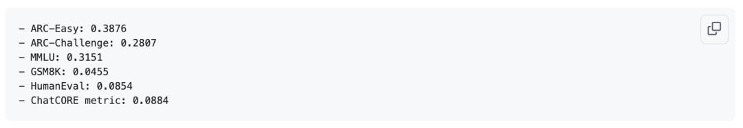 To give a specific example: after 24 hours of training, a model with a depth of 30 can achieve a score of over 40 on the MMLU dataset, over 70 on the ARC-Easy dataset, and over 20 on the GSM8K dataset (equivalent to the computing power consumption of GPT-3 Small 125M, only one thousandth of GPT-3).