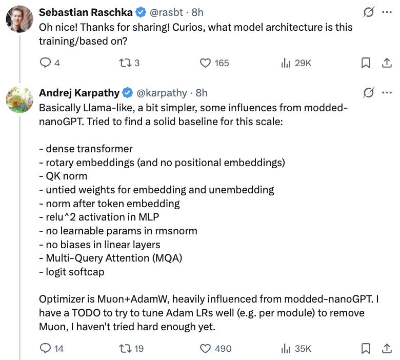 In the comments section, Kapasi also explained that the basic architecture of nanochat is similar to that of Llama, but simpler, and also borrows some of the design of modded-nanoGPT. The overall goal is to find a robust infrastructure for models of this scale.