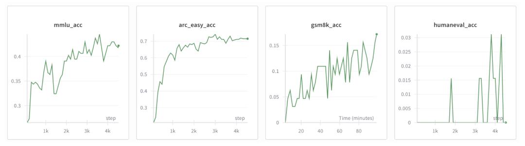 There really isn’t a great chart to show this step, but here’s an example from a previous mid-train run of another, larger model, just to give you an idea of what these metrics look like as they rise during a fine-tuning run: