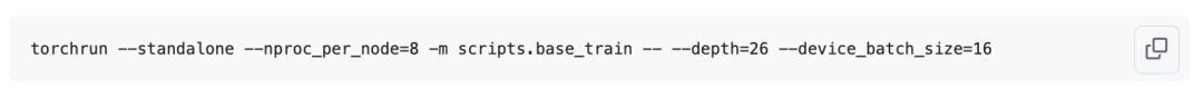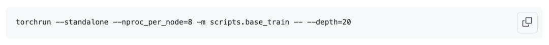 Here, we launch training on 8 GPUs using the scripts/base_train.py script. We are training a 20-layer Transformer. By default, each GPU processes 32 rows of data with 2048 tokens per row during each forward/backward pass, for a total of 32 × 2048 = 2¹⁹ = 524,288 ≈ 0.5M tokens per optimizer step.