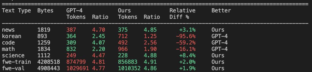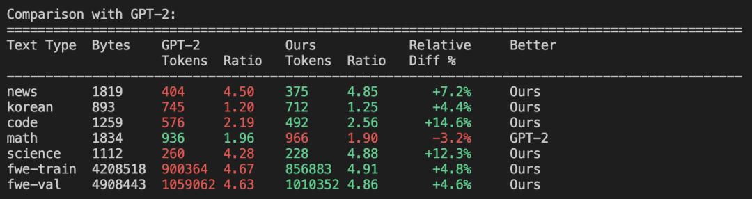 The evaluation results show that a compression ratio of about 4.8 was achieved (that is, an average of 4.8 characters in the original text were compressed into 1 token). The comparison results with the GPT-2 and GPT-4 word segmenters can also be seen.