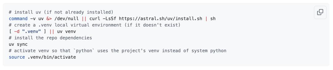 First, make sure you have the popular uv project manager installed. Install uv, create a new virtual environment in the .venv directory, get all the dependencies, and then activate the environment. This way, when you type python, you will use the Python in the virtual environment instead of the system's own Python: