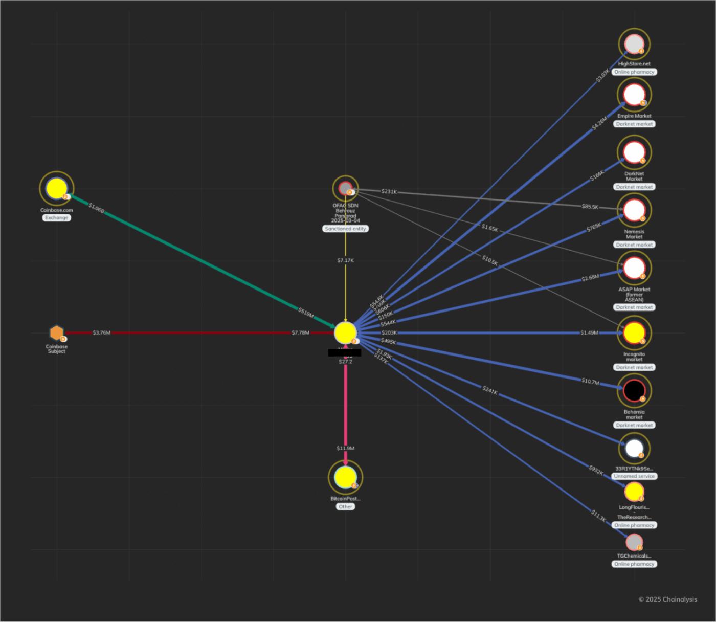 This transactional pattern provided critical insights: the subject was operating either as a vendor or supplier to vendors on darknet markets. Beyond direct marketplace activity, the investigation also identified indirect exposure to entities selling synthetic chemicals used in fentanyl production, including connections to OFAC-sanctioned entities.