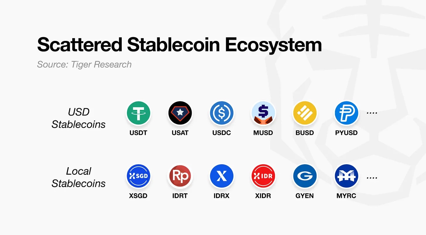However, the fragmentation problem is intensifying with the increasing adoption of stablecoins . For dollar-based stablecoins alone, there are various types, such as USDT, USDC, USAT, PYUSD, and MUSDC, issued by various institutions. Each circulates on a different blockchain. The existence of local stablecoins denominated in euros, yen, and won further complicates this situation.