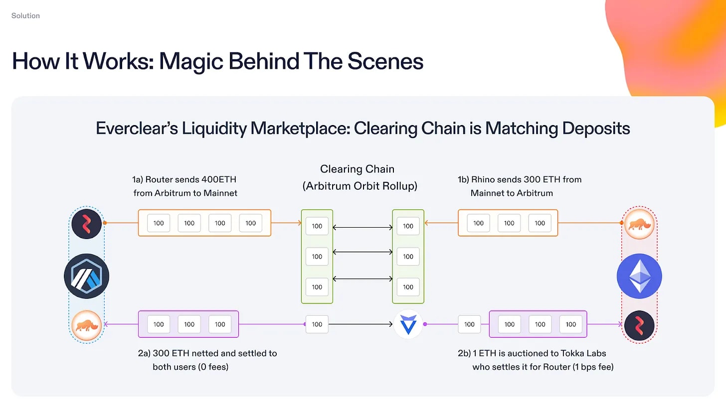 Everclear provides the most direct and effective solution to the structural inefficiencies that arise in today's multi-chain environment. As explained in a previous report , Everclear's core concept is to bring the clearing mechanism from traditional finance to the blockchain. Clearing minimizes the actual movement of assets by netting multiple transactions, thereby reducing costs and increasing operational efficiency. Simply put, this mechanism "eliminates" multiple fund movements by balancing them against each other, rather than processing each transaction individually.