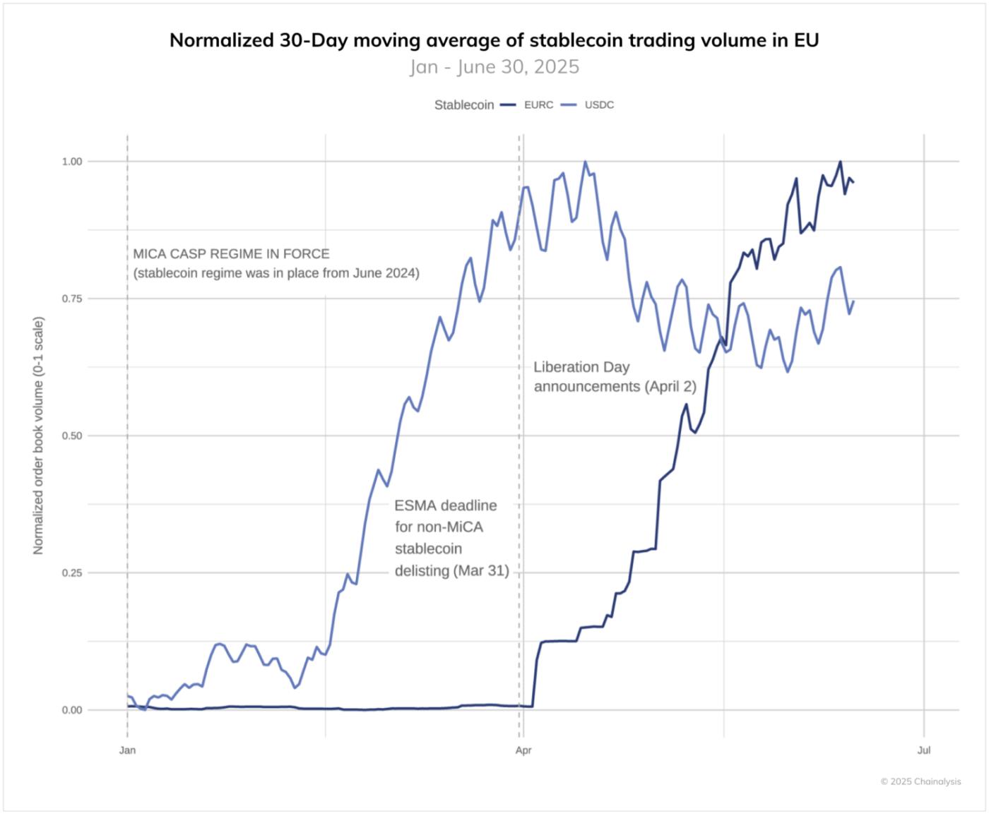 - March 2025 (ESMA deadline): USDC volumes stabilized, indicating completion of compliance-driven restructuring.