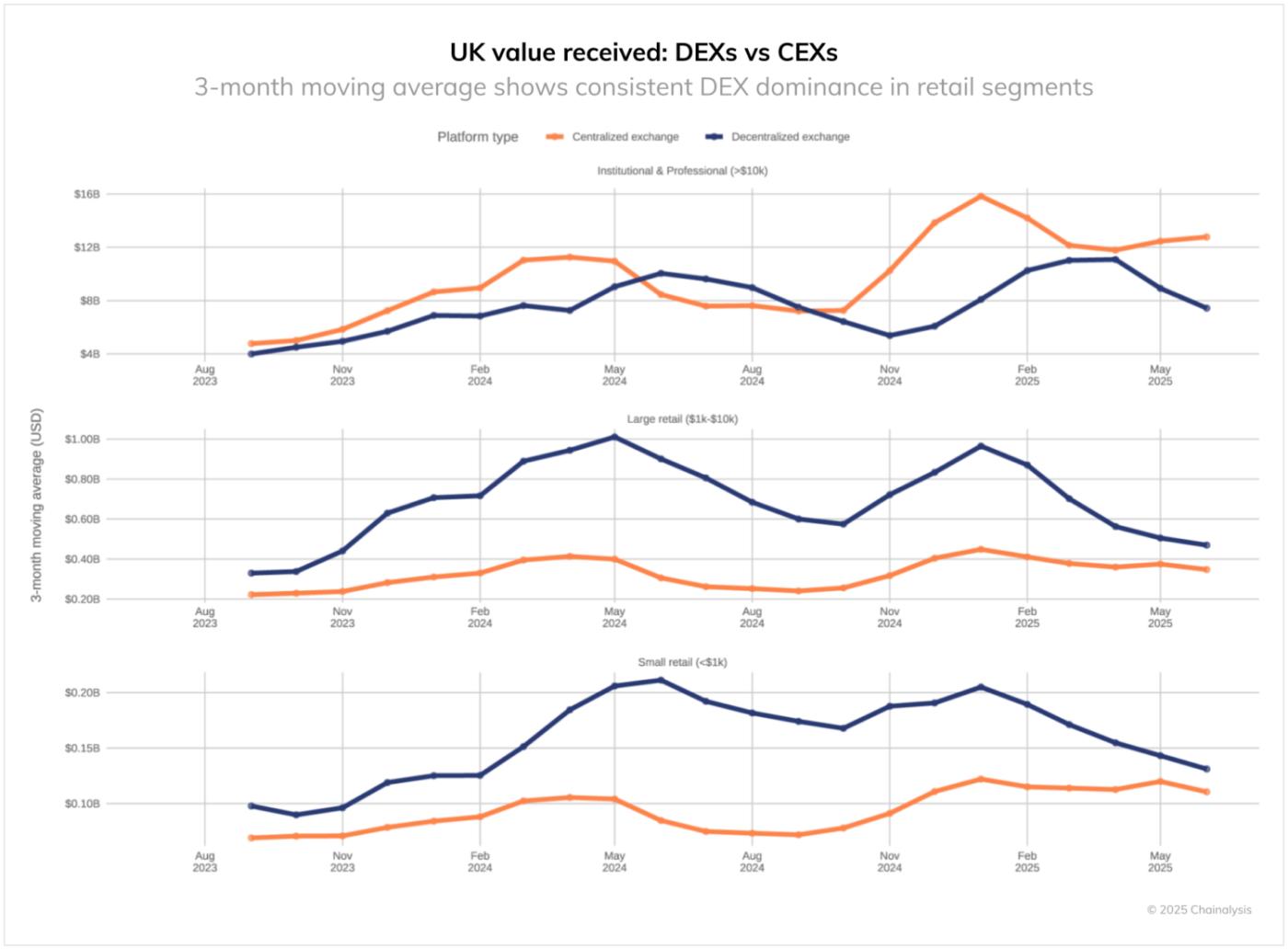 In essence, the UK crypto market isn’t contracting but rather evolving: retail traders increasingly favor DeFi platforms while institutional players maintain their preference for centralized venues, suggesting a market adapting to both regulatory changes and expanding opportunities.