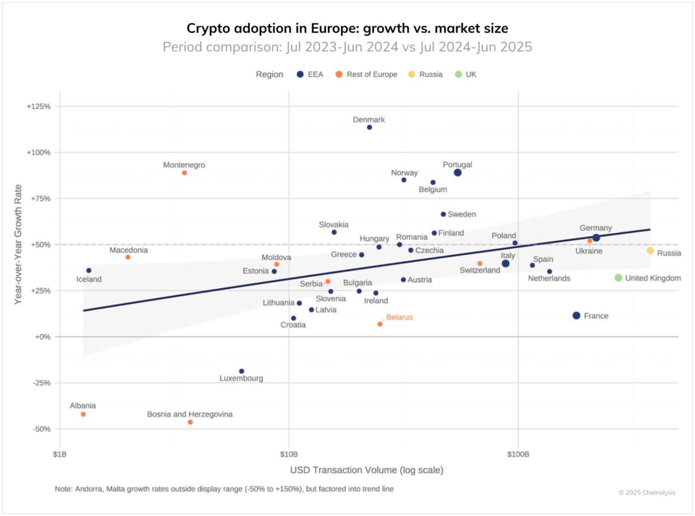 Growth patterns across the wider European area reveal a distinct relationship between market scale and growth rates, with country-level expansion driven by unique national factors within broader regulatory frameworks. Several large crypto economies stand out. Germany’s 54% growth reflects its emergence as a preferred destination for crypto-native firms, seemingly attracted by its established financial infrastructure and smooth implementation of MiCA regulations. Similarly significant are Ukraine (52%) and Poland (51%), where grassroots adoption and remittance flows continue to fuel market expansion.