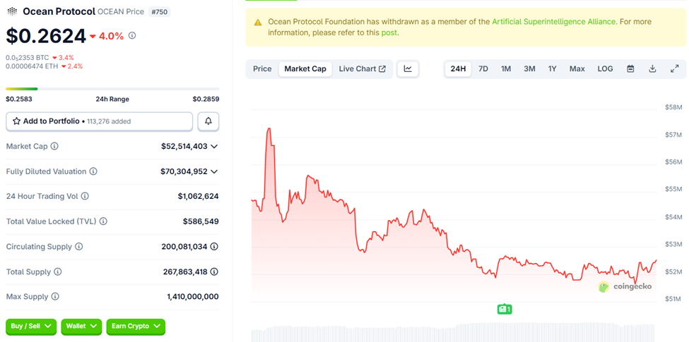 Since the split, OCEAN’s price has plunged from a March 2024 peak above $1.00 to roughly $0.2625, while the foundation announced plans to buy back and burn OCEAN tokens using project profits. This measure is aimed at supporting long-term value.