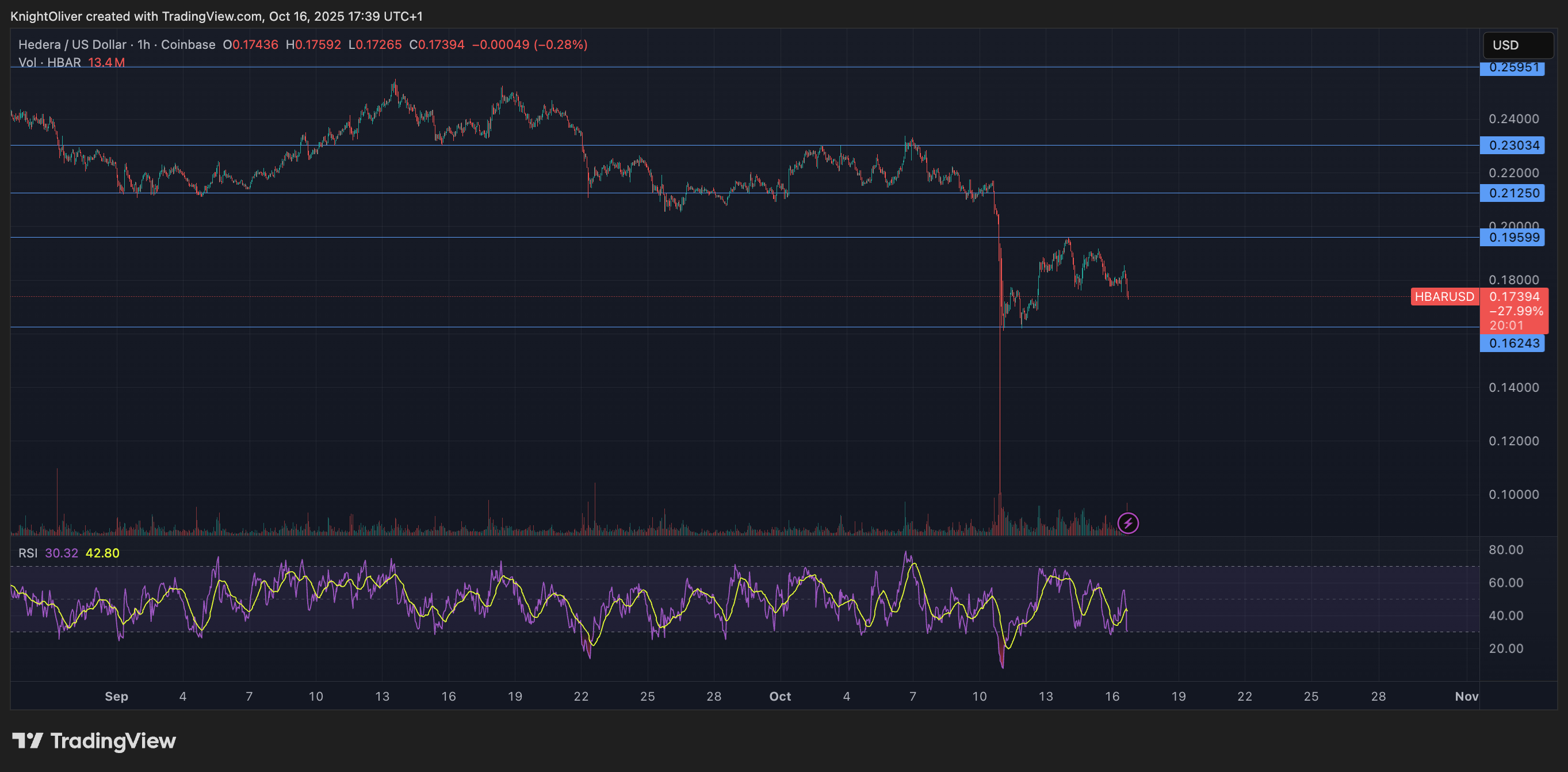 HBAR endured a volatile 24-hour stretch as institutional traders managed a narrow but intense range between $0.176 and $0.185. The token initially fell on corporate profit-taking before rebounding strongly during morning hours on Oct. 16, when enterprise trading volumes surged above 129 million.