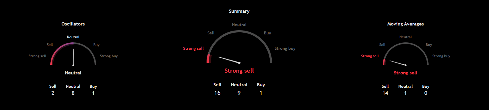 Furthermore, moving averages show a strong sell signal. Of the 15 indicators highlighted, just one is neutral, with the others all flashing bearish signs.