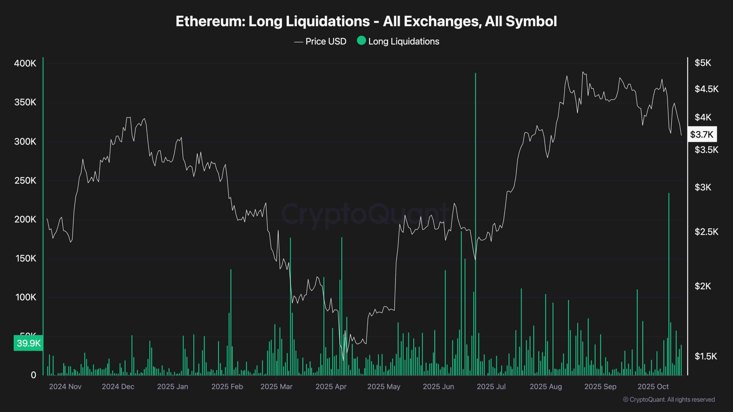 Ethereum’s latest drop triggered a notable spike in long liquidations across all exchanges, marking one of the largest deleveraging events in recent months. This surge in forced selling reflects how overconfident long traders were caught off guard by the market’s swift reversal.