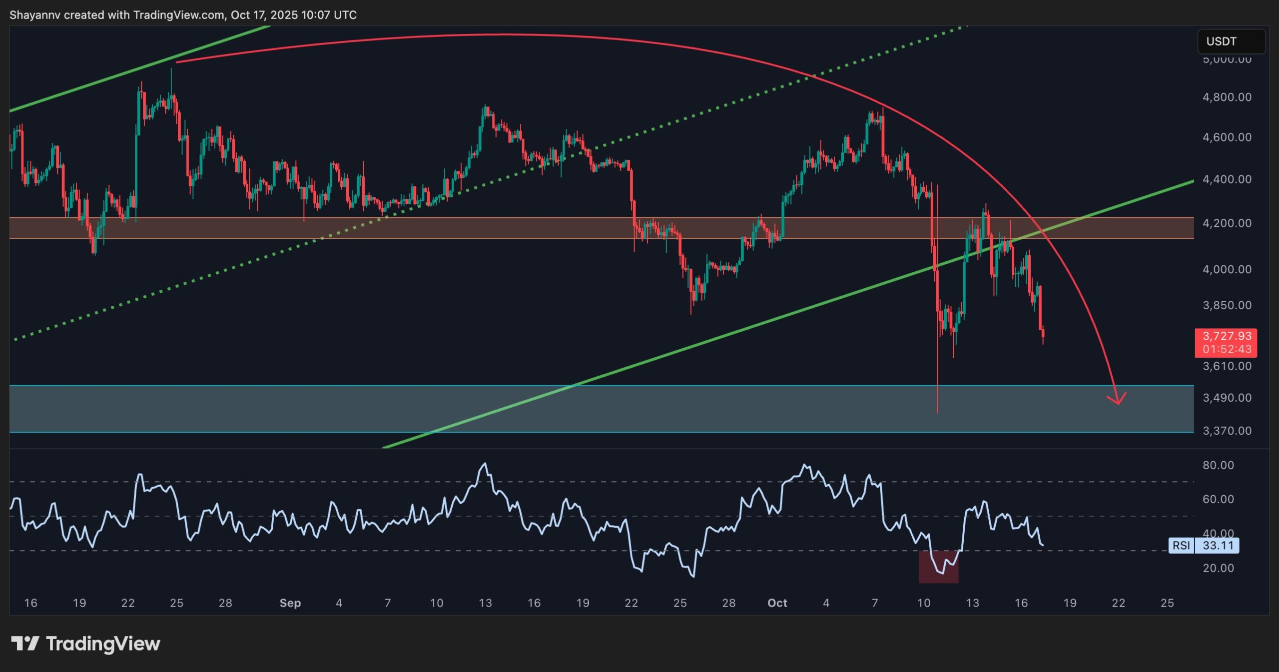 Ethereum continues its correction phase after failing to maintain momentum above $4,200. The market’s sentiment remains cautious as ETH trades around $3,700, showing weakness both technically and sentiment-wise. Buyers are seemingly losing control, and the focus now shifts to key support zones below.