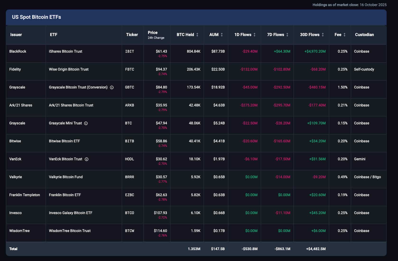 According to ETF flow tracker data shared by HeyApollo co-founder Thomas Fahrer, IBIT sold 272 BTC on October 15 and another 272 BTC on October 16, bringing its two-day outflow to 544 BTC, worth around $57 million at current prices.