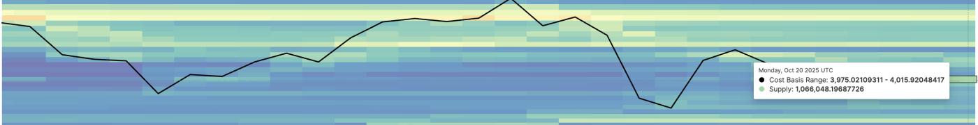 Right now, a dense resistance band exists between $3,955 and $4,015, with about 1.06 million ETH purchased in this range. This makes the area just above the current ETH price difficult to break, as every move toward $4,000 brings more selling pressure.