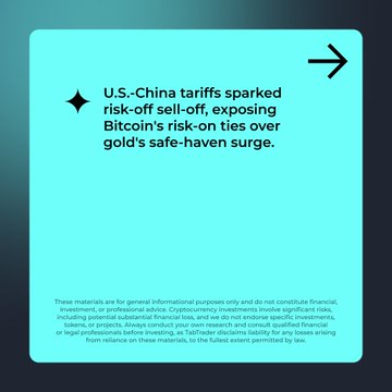 🌍 U.S.–China tariff headlines sparked a risk-off move, pushing BTC lower while gold rallied
