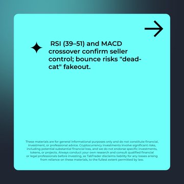 📉 RSI (39–51) and a bearish MACD crossover confirm seller control
