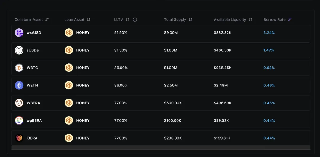 On the Borrow side, we can use assets such as wsrUSD, wETH, wBTC, wBERA, sUSDe, wsrUSD, iBERA, wgBERA, etc. as collateral to lend HONEY assets from the pool for further income.