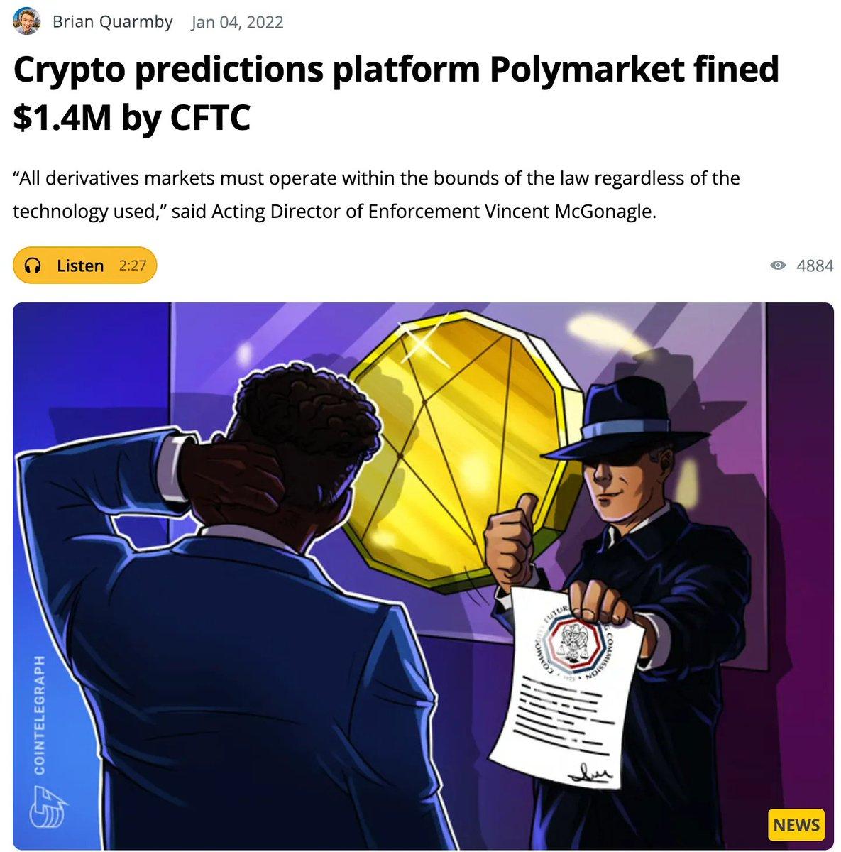 Polymarket experienced rapid growth after its June 2020 launch, but in January 2022, it received a severe penalty from the CFTC: a $1.4 million fine for failing to register as an exchange and a ban on providing services to US users. For the following two years, Polymarket was restricted to non-US locations.