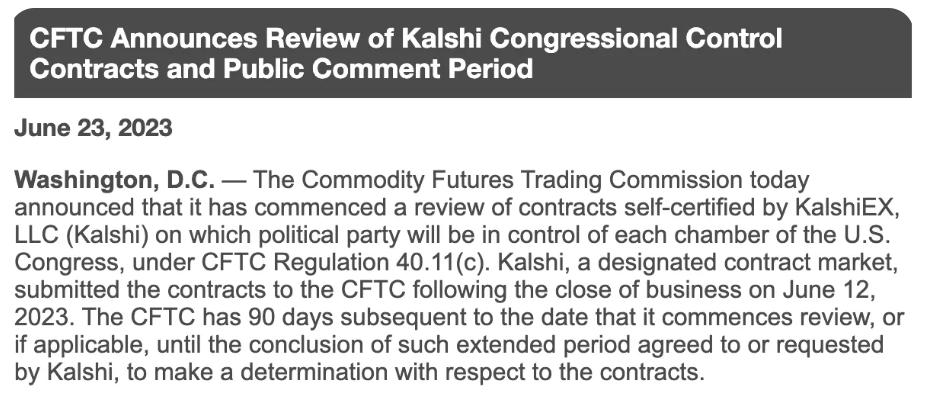 However, in June 2023, after Kalshi self-certified and launched a "Congressional Control" market, the CFTC objected, arguing that such a market constituted betting on sports events, violated state law, and was not in the public interest. Kalshi filed a lawsuit in federal court in November of that year and prevailed in September 2024. The CFTC withdrew its appeal, completely clearing Kalshi of this regulatory hurdle.