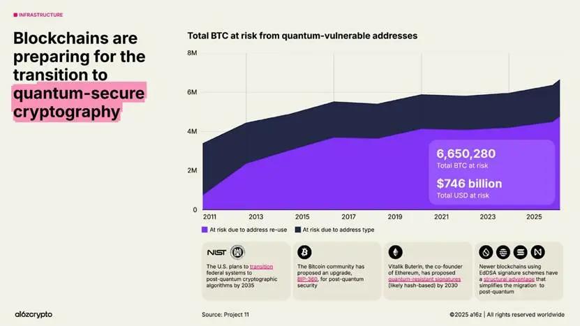 Meanwhile, blockchain is accelerating its post-quantum roadmap. Approximately $750 billion in Bitcoin is stored in addresses vulnerable to future quantum attacks. The U.S. government plans to transition federal systems to post-quantum cryptographic algorithms by 2035.