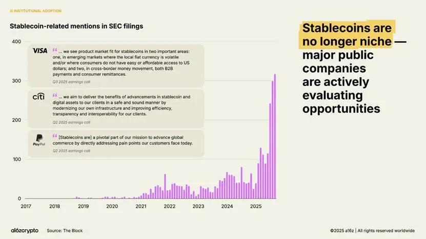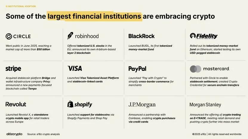 2025 is the year of institutional adoption. Just five days after last year's State of Crypto report concluded that stablecoins had found product-market fit, Stripe announced its intention to acquire Bridge, a stablecoin infrastructure platform. The race is on: Traditional financial firms are also preparing to openly enter the stablecoin space.