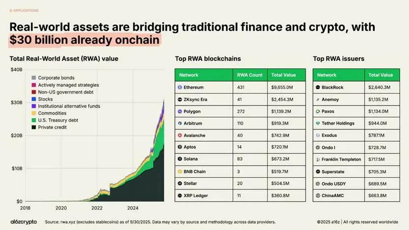 Real-world assets (RWAs)—traditional assets like U.S. Treasuries, money market funds, private credit, and real estate, represented on-chain ("tokenized")—bridge the gap between cryptocurrency and traditional finance. The total market size for tokenized RWAs is $30 billion, having grown nearly fourfold in the past two years.