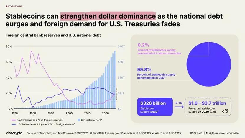 But stablecoins are bucking this trend: over 99% of stablecoins are denominated in U.S. dollars, and their value is projected to grow tenfold to over $3 trillion by 2030, providing a potentially strong and sustainable source of demand for U.S. debt in the coming years.