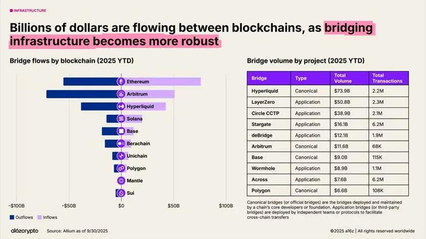 Cross-chain bridges are enabling blockchains to interoperate. Protocols like LayerZero and Circle's Cross-Chain Transfer Protocol allow users to move assets across multiple blockchain systems. Hyperliquid's canonical cross-chain bridge has also seen $74 billion in transaction volume year-to-date.