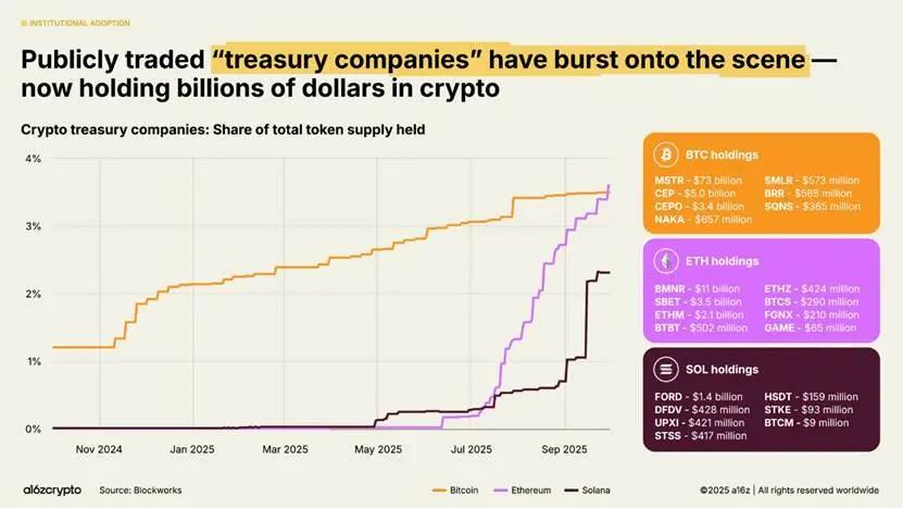 Publicly traded “digital asset treasury” (DAT) companies—entities that hold cryptocurrencies on their balance sheets, much like a corporate treasury holds cash—now collectively hold about 4% of all Bitcoin and Ethereum in circulation. Together, these DATs and exchange-traded products now hold about 10% of the total Bitcoin and Ethereum token supply.