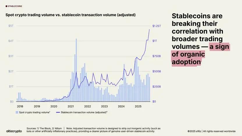 Adoption is accelerating. Monthly adjusted stablecoin trading volume has surged to an all-time high, reaching nearly $1.25 trillion in September 2025 alone.