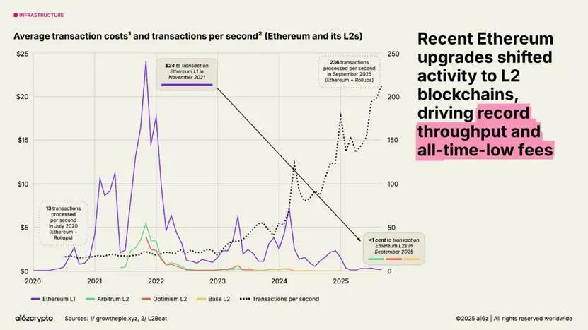 Ethereum continues to execute on its scaling roadmap, with the majority of its economic activity migrating to Layer 2 (L2) platforms such as Arbitrum, Base, and Optimism. The average transaction cost on L2 has dropped from approximately $24 in 2021 to less than 1 cent today, making block space on Ethereum cheap and plentiful.