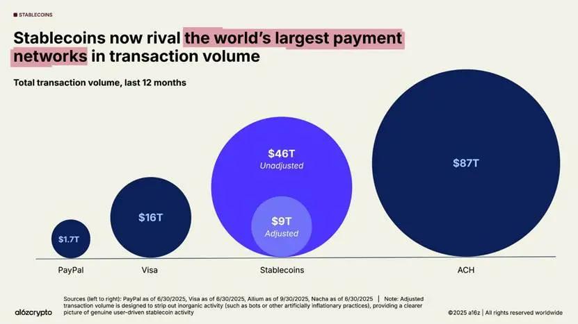 • Stablecoins support $ 46 trillion ( $ 9 trillion adjusted ) in annual transaction volume , comparable to Visa and PayPal .