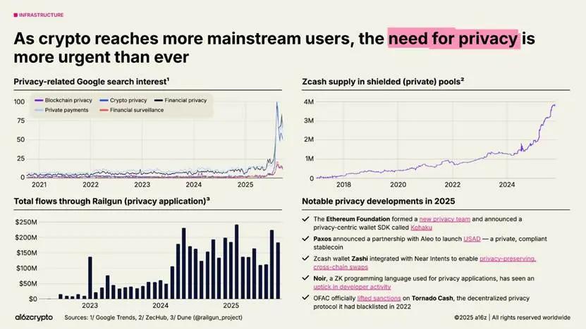 Privacy is returning to the forefront and may become a prerequisite for wider adoption. Indicators of growing interest: Google searches related to crypto privacy surge in 2025; Zcash’s shielded pool supply grows to nearly 4 million ZEC; and Railgun’s transaction flow exceeds $200 million per month.