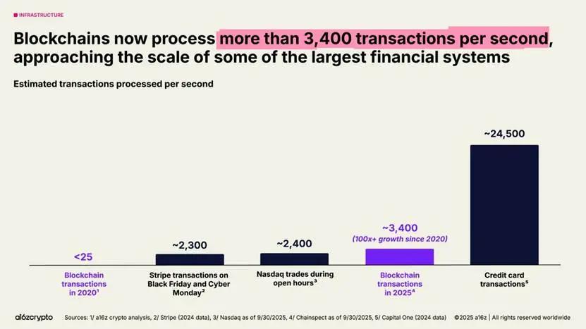 In just five years, the aggregate transaction throughput of major blockchain networks has increased more than 100-fold. Back then, blockchains processed fewer than 25 transactions per second. Now they handle 3,400 transactions per second, comparable to Nasdaq's completed transactions or Stripe's global throughput on Black Friday—and at a fraction of the historical cost.