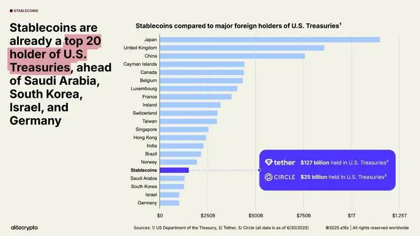 Stablecoins are now a global macroeconomic force: over 1% of the US dollar now exists in tokenized stablecoins on public blockchains, and stablecoins are now the 17th largest holder of US Treasuries, up from 20th place last year. Overall, stablecoins hold over $150 billion in US Treasuries—more than many sovereign nations.