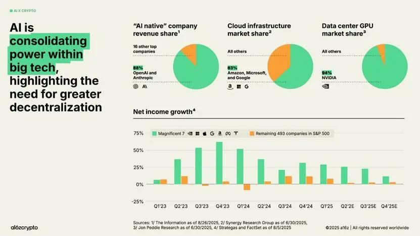 At the same time, the computing layer of AI is consolidating around a handful of tech giants, raising concerns about centralization and censorship. Just two companies, OpenAI and Anthropic, control 88% of the revenue of "AI-native" companies. Amazon, Microsoft, and Google control 63% of the cloud infrastructure market, while Nvidia holds 94% of the data center GPU market. These imbalances have driven double-digit quarterly net revenue growth for the "Big Seven" companies over the past few years, while overall earnings growth for the rest of the S&P 500 has failed to exceed the rate of inflation.