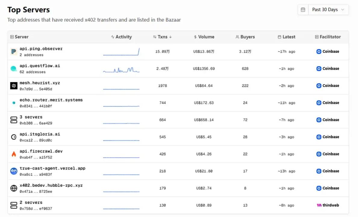 Data from the past 30 days shows that $PING's interface has received more than 150,000 x402 transactions, with a total amount of approximately $140,000, far ahead of the second-ranked Questflow.