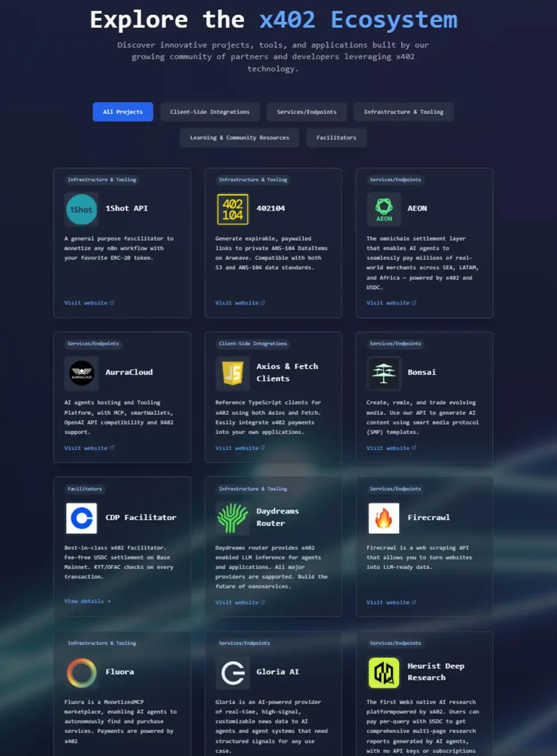 The Ecosystem page on the x402 protocol's official website provides a summary of current projects. Clicking through each project reveals that the protocol is still in its early stages of development. Many projects directly lead to technical documentation or Github links.