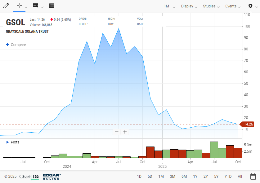 In the past day, volumes for GSOL increased. The asset remains volatile and may trade above or below the SOL included in each share. Currently, the trust carries $14.19 SOL per share, while trading at $14.26.