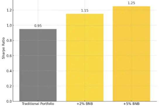 BNB is not only tailored for crypto-native users, but its design is also easy for newcomers with no crypto experience to understand and use. Introducing BNB can significantly improve risk-adjusted returns; for example, in simulated models, adding 2%–5% of BNB to a standard stock-bond-commodity portfolio increases the Sharpe ratio from 0.95 to as high as 1.25. This demonstrates the effectiveness of BNB as an alternative asset allocation—enhancing diversification and capturing Web3 engagement and potential returns. Current market conditions may present asset management firms with a structural opportunity to integrate BNB as an alternative asset.