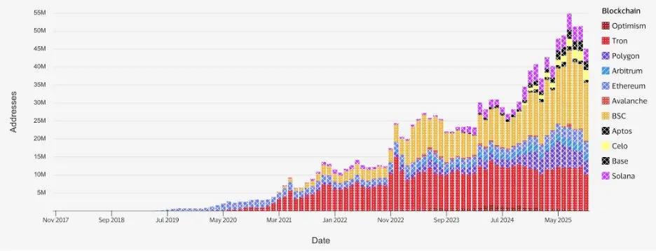 - The largest number of active independent stablecoin wallet addresses (approximately 20 million)
