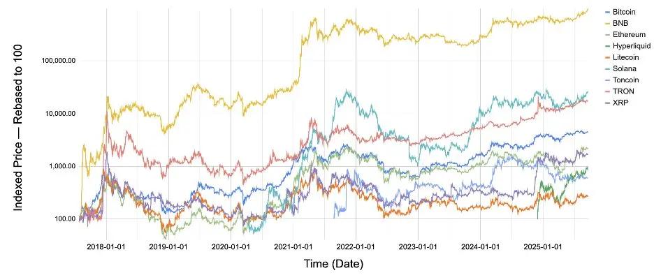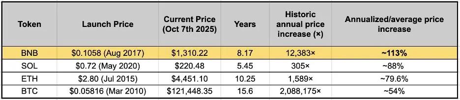 Across multiple market cycles, BNB has consistently demonstrated structural superiority compared to its Layer-1 blockchain counterparts and benchmark digital assets. Its long-term value growth reflects a combination of functional utility, programmatic supply discipline, and large-scale ecosystem integration.