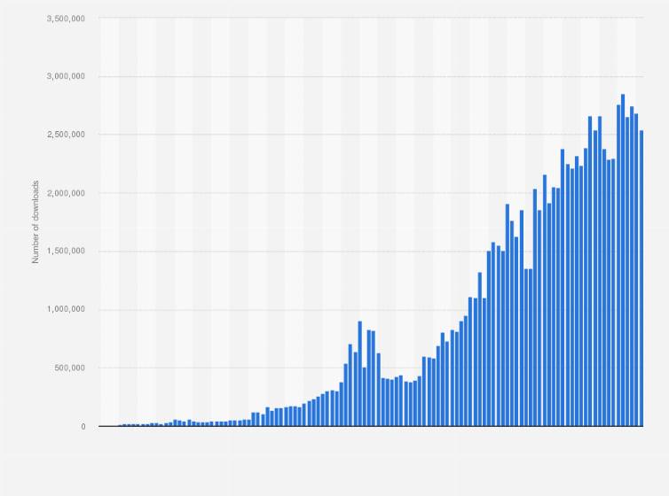 The chart below shows the total app downloads of Revolut, one of the original and largest neobanks in the world, from 2014 to 2025: