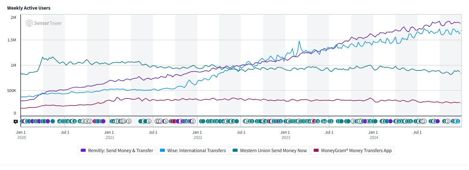 And this one shows how users are moving away from the old tradfi institutions Western Union and MoneyGram in favor of newer neobanks, Remitly and Wise: