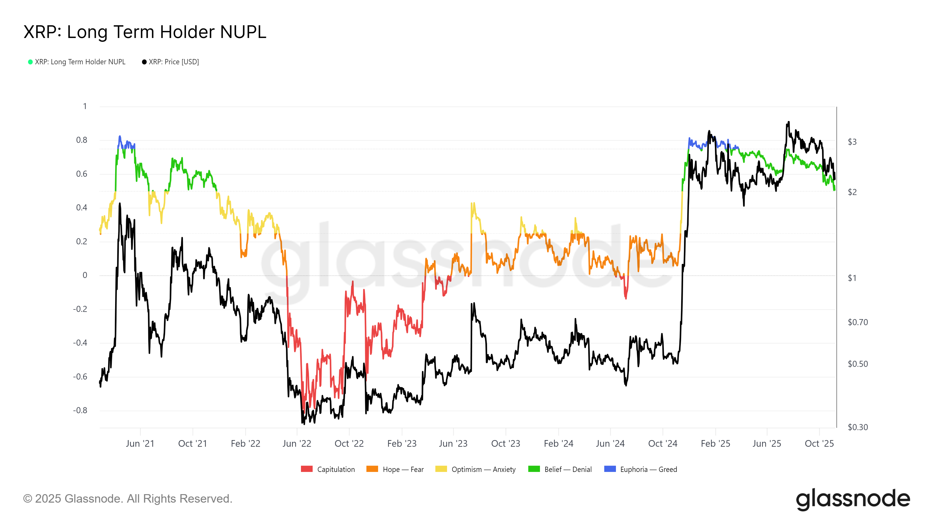 The Long-Term Holder Net Unrealized Profit/Loss (LTH NUPL) indicator is nearing the crucial 0.5 threshold, signaling potential weakness. Historically, a drop below this level has coincided with significant price corrections as investors rush to secure remaining gains. Should the indicator slip further, selling pressure could intensify across the market.