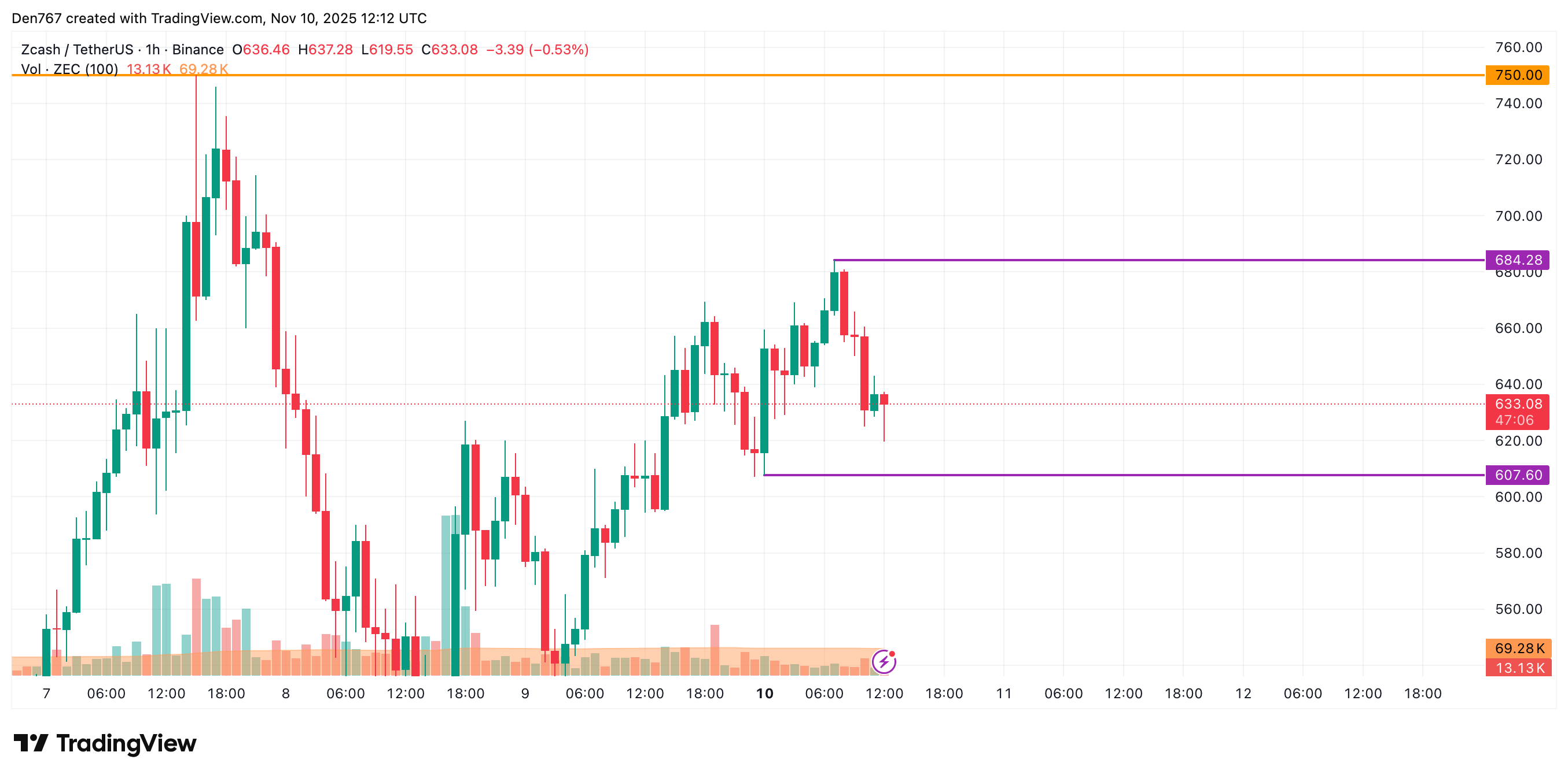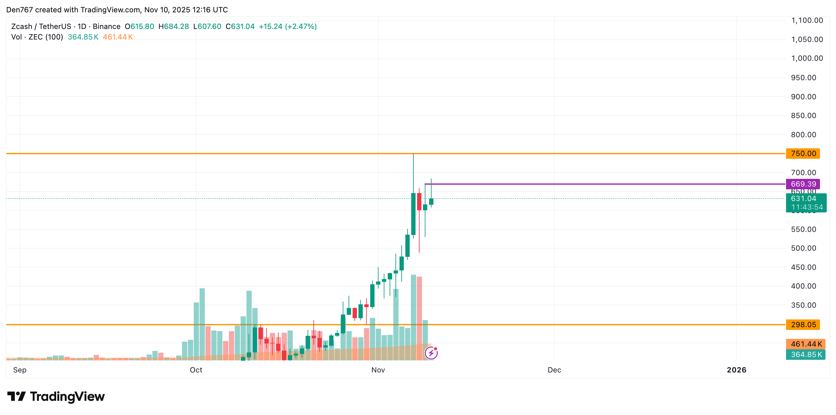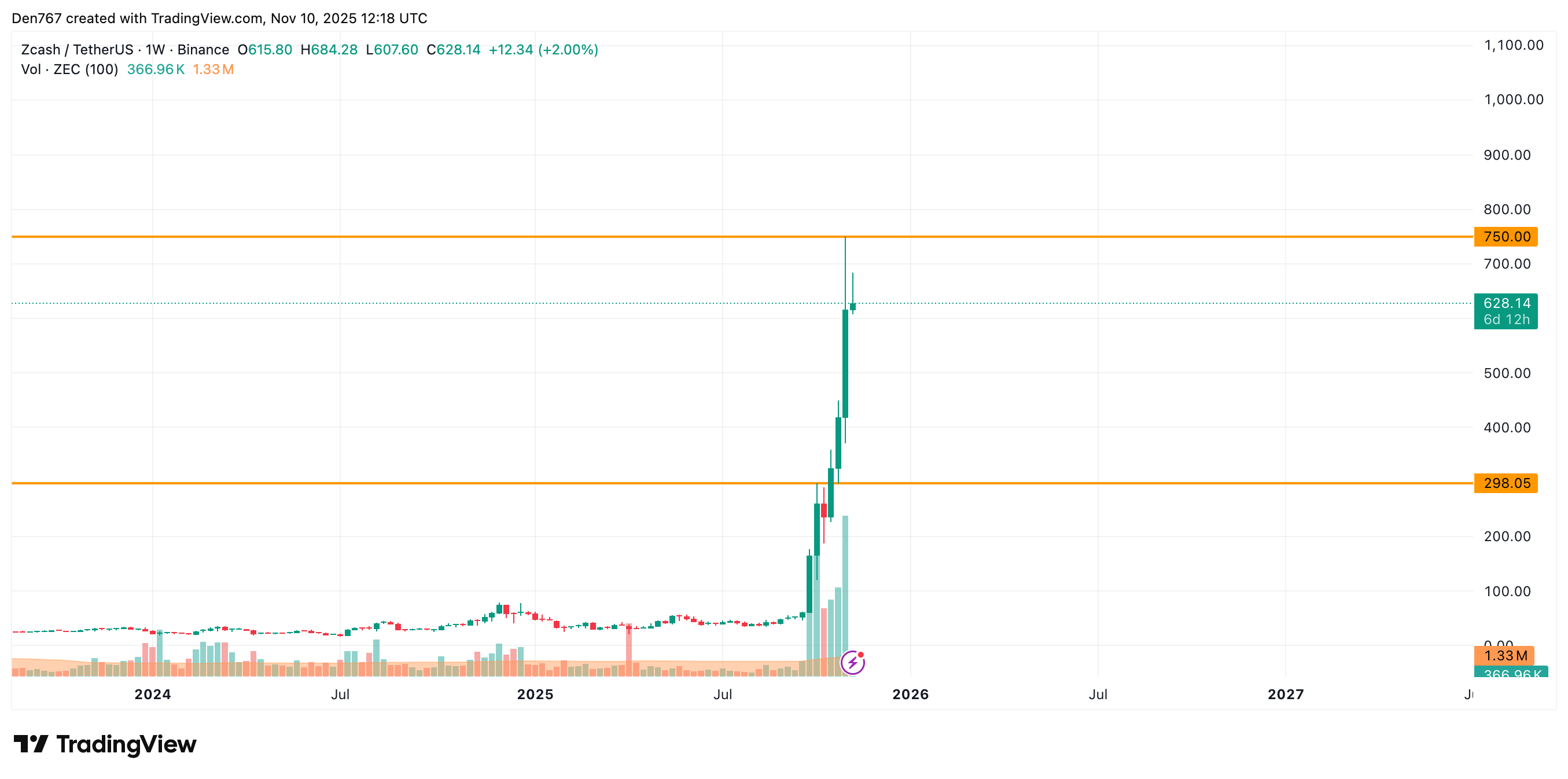 ZEC is trading at $628.14 at press time.