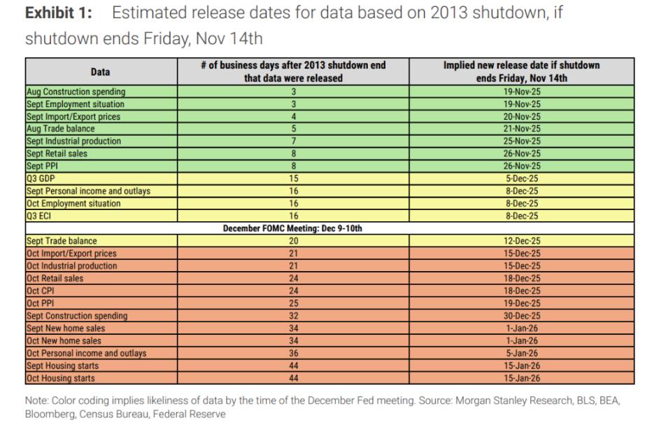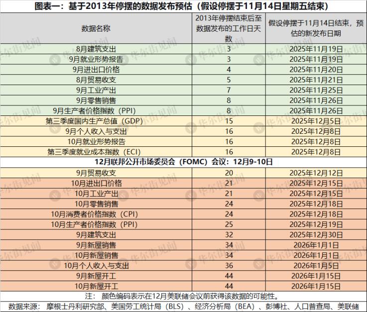 According to TrendFocus, Morgan Stanley, in a research report released on November 10th, predicted the release schedule for key economic data based on its experience in 2013. The report indicated that once the government resumes operations, the delayed economic data will begin to be released gradually.